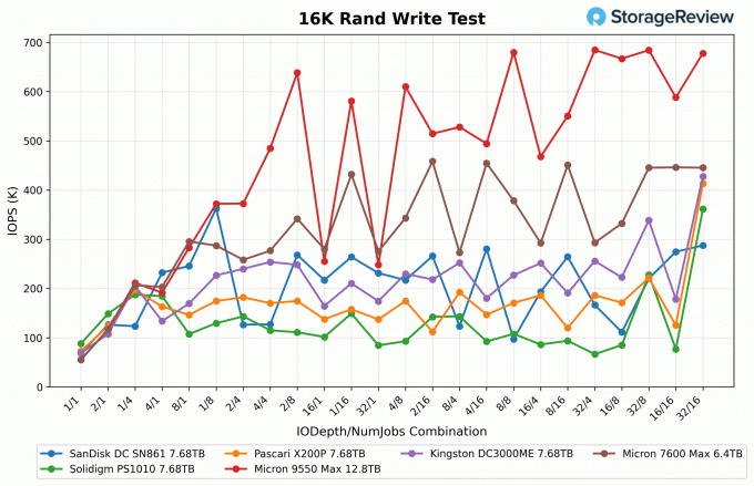 Nel test di lettura casuale a 16K, il Micron 7600 MAX (6,4 TB) ha fornito prestazioni costanti durante la scansione, che vanno da 17K IOPS all'estremità bassa a circa 350K IOPS in media,e raggiunge il picco vicino a 720K IOPS a più alte profondità di codaLa sua stabilità lo rendeva uno dei più prevedibili, mantenendo una scalabilità regolare anche se non raggiungeva la cima della classifica.